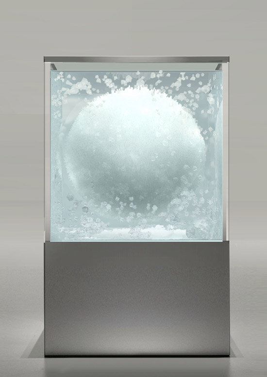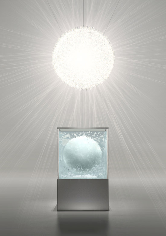 For ‘stellar’, Tokujin has brought together the explorations made in his previous work, with the intentions of creating a ‘star’, a large spherical illuminated crystal mass, descending from the sky, emitting rays of light into the exhibition space.
