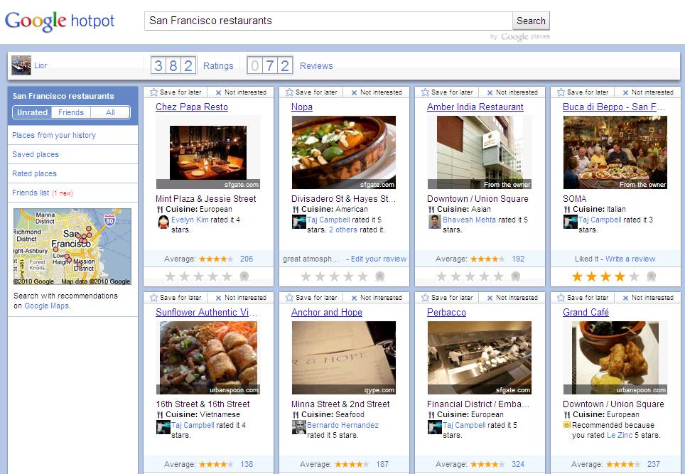 Hotpot: Google calls Hotpot “a local recommendation engine powered by you and your friends.” It’s essentially Google’s version of Yelp. You can search the over 50 million places Google has data about and rate the places you’ve visited using a five-star system. When you give a location a positive review, Hotpot will recommend other places to you that are similar to place you visited. For example, if you give a seafood restaurant a five-star rating, Hotpot will show you other similarly themed restaurants in your city that you’ll likely enjoy. You can also share your places rating with friends and see the places they’ve recommended using Hotpot. Using a Google account you can access the Hotpot rating app to get started. You can rate places, invite friends to the service, and view their recommendation on the desktop in Google Maps using that app, and you can rate on-the-go using the Maps app on Android devices.