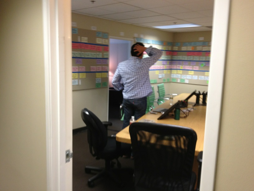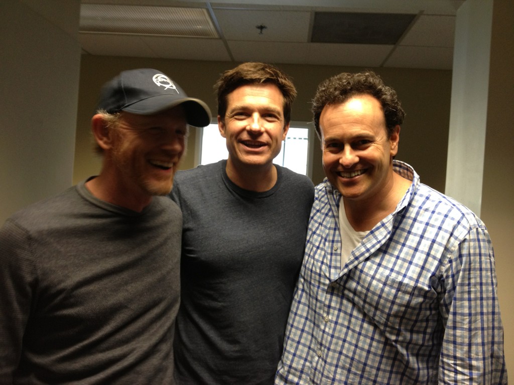 First Howard tweeted, “Arrested Development for Netflix. IT’S ALIVE. This is what the writer’s room looks like.” Attached was a picture of conference room with tons of colored index cards clinged to walls with indecipherable episode ideas scribbled on them. (See the image of the the break.) A couple hours later Howard took another picture and tweeted, “Mitch [Hurwitz] let Jason [Bateman] and I in on some of the twists and turns ahead. hilarious.” This one features Howard, AD creator Mitch Hurwitz, and star Jason Bateman. (The image is embedded above.)