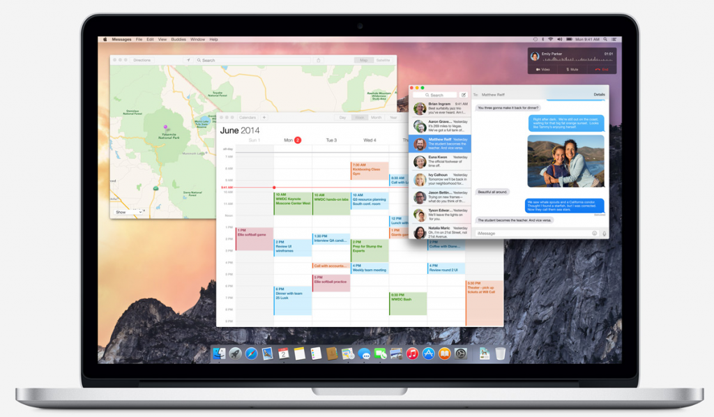 The next version of Apple’s desktop OS is OS X Yosemite and it too packs a quite the punch. You’ll notice right off the bat a cleaner take on the user interface: translucent, streamlined toolbars, and a more consistent and simplified experience from a fresh new look for the Dock and app icons to a new system-wide typeface. Search using Spotlight has been upgraded as well. Click that magnifying glass and in Yosemite a window will appear front and center; type query and the new Spotlight will search your files as well as outside sources like Wikipedia and the iTunes and App Stores to try and find what you’re looking for. A major enhancement to Notification Center lies in the new Today tab; here you’ll see a summary of the day’s upcoming events, reminders, and birthdays. You can also glance at customizable Widgets from apps like Calendar, Weather, Stocks, World Clock, Calculator, and Reminders. Apps like Safari (tab organization), Mail (attachment markup), Finder (iCloud integration), and Messages (see below) have been updated too.