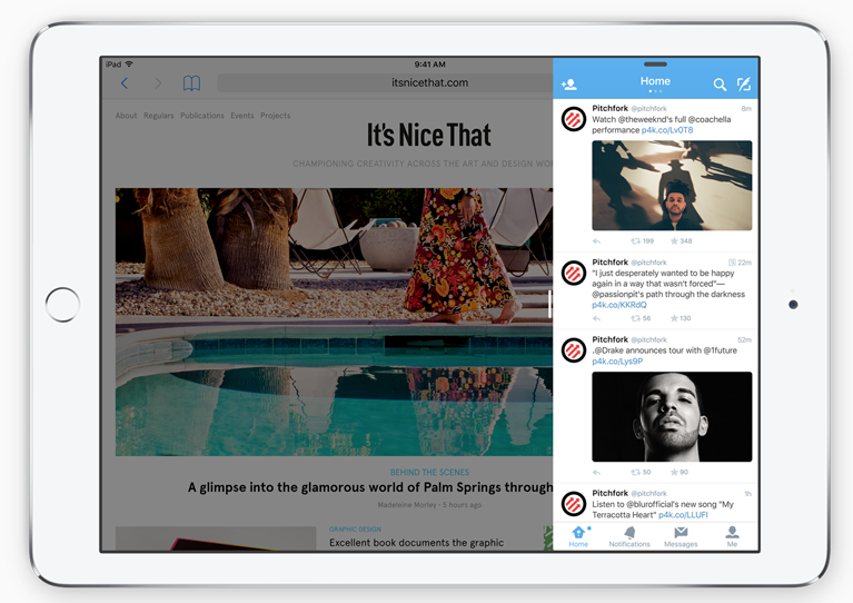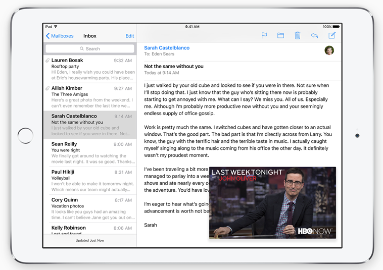 iOS 9 packs productivity enhancements coming to iPad, and it’s a doozy. Multitasking is better on iPad thanks to a slew of new UI features. Double tap the Home button to access the new Task Switcher which sports full-screen app preview cards stacked on top of one another; tap to open one full-screen as usual. With Slide Over, you can quickly open a second app without leaving the one you’re currently in. Swipe from the right to pull a second app in; for example, if you receive an email while browsing Safari, simply swipe from the right, tap Mail, and respond to the message without leaving the web browser. Note that while you’re in Slide Over mode, the primary app that’s open (in this case, Safari) is not usable. The primary app goes live again when you slide the secondary app out of frame. Thankfully, though, Apple is incorporating Split View from El Capitan on iPad as well. Use the app divider to slide and resize two apps next to each other; in this mode, both apps are live and fully functional at your fingertips. iOS 9 also supports Picture in Picture; so while you’re watching a video or FaceTiming a friend, you can move across the OS and the video frame will remain in focus in a corner of the display. Use your finger to move it around and resize it to your liking; you can even it push it out of frame if you just want to capture audio for whatever reason. Note: Slide Over and Picture and Picture are coming to iPad Air, iPad Air 2, iPad mini 2, and iPad mini 3, and Split View will only work on the more powerful iPad Air 2. Last, the QuickType keyboard on iPad has been improved with new functionality. Shortcuts like cut/copy/paste have been added directly above the keyboard. Plus, now you can place two fingers atop the virtual keyboard to turn it into a trackpad and control the on-screen cursor to select, edit, and move text. This makes typing and editing on iPad so much more efficient and intuitive. And now, when you attach a physical keyboard to your iPad, shortcuts such as app switching have been made more accessible.