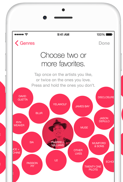 For You is the section that recommends playlists and albums that are personalized to our taste based on the music you listen to and enjoy. Apple is being very loud about these recommendations: they are not based on arbitrary algorithms; they are made by human “experts who know and love music.” Apple’s hired a team of music-lovers whose job it is to be on the bleeding-edge of music discovery and help curate playlists and find albums tuned specially for you. Here’s how it works. When you first tap into the For You section, you’ll be asked to select genres of music you’re into as well as the artists you like. Apple will collect this info and instantly provide you with human-curated playlists that should, theoretically, get your foot tapping. When making these playlists for you, Apple also takes into consideration your purchased music from iTunes, your personal playlists, as well as the songs you heart. The new Now Playing screen includes a heart icon located to the left of the playback controls. Tap it to like a song or album, and Apple will see you’ve done that and this will come in handy when you dive into For You to explore your curated playlists and albums. In addition to playlists made by Apple’s experts, this section is also home to playlists curated by major industry players such as Rolling Stone, Pitchfork, Shazam, and other popular magazines, websites, and tastemakers.